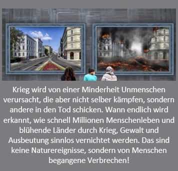 NIE WIEDER WAHNSINN! Bleibt das ein Wunschtraum? Utopie? Die Welt brennt bereits in großen Teilen! Wieder einmal verursacht durch MachtMÄNNER. Die Geschichte wiederholt sich, sagt man. Aber muss das so sein? Wie schaffen wir es, aus diesem Hamsterrad der negativen Nachrichten und Manipulationen auszusteigen und uns verstärkt und gewaltlos für eine friedvollere Welt und gute Zukunft einzusetzen?